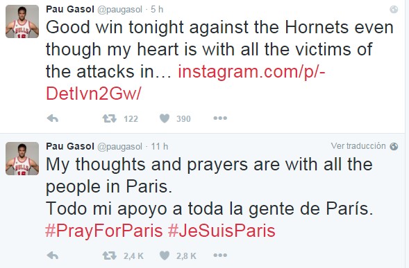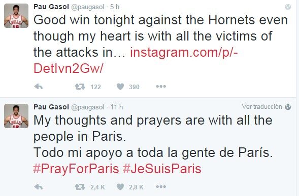 La noche NBA estuvo marcada desgraciadamente por lo sucedido en París. La noticia de los atentados en Francia pilló por sorpresa a los equipos que tenían que disputar sus respectivos partidos pocas horas después, Pau y Marc Gasol entre ellos. El jugador de los Bulls mandó un mensaje de apoyo a través de Twitter antes y después del partido.