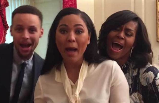 Durante el acto se vio la complicidad que había entre Curry y Obama, bromas e imitaciones incluidas por parte del presidente, pero hace unas horas, la Primera Dama, Michelle Obama, ha publicado un vídeo en Twitter en el que se puede ver a ella misma junto a Stephen Curry y su mujer, Ayesha, haciendo un karaoke de la canción de los Minions 'Banana'.