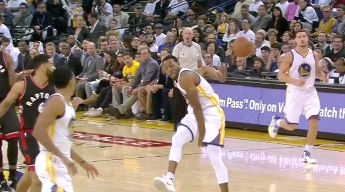 Iguodala se inventa una asistencia mágica para que Shaun Livingstone la culminara con un mate. Lástima que no valiera porque los árbitros ya habían pitado una falta previa sobre Kevin Durant.