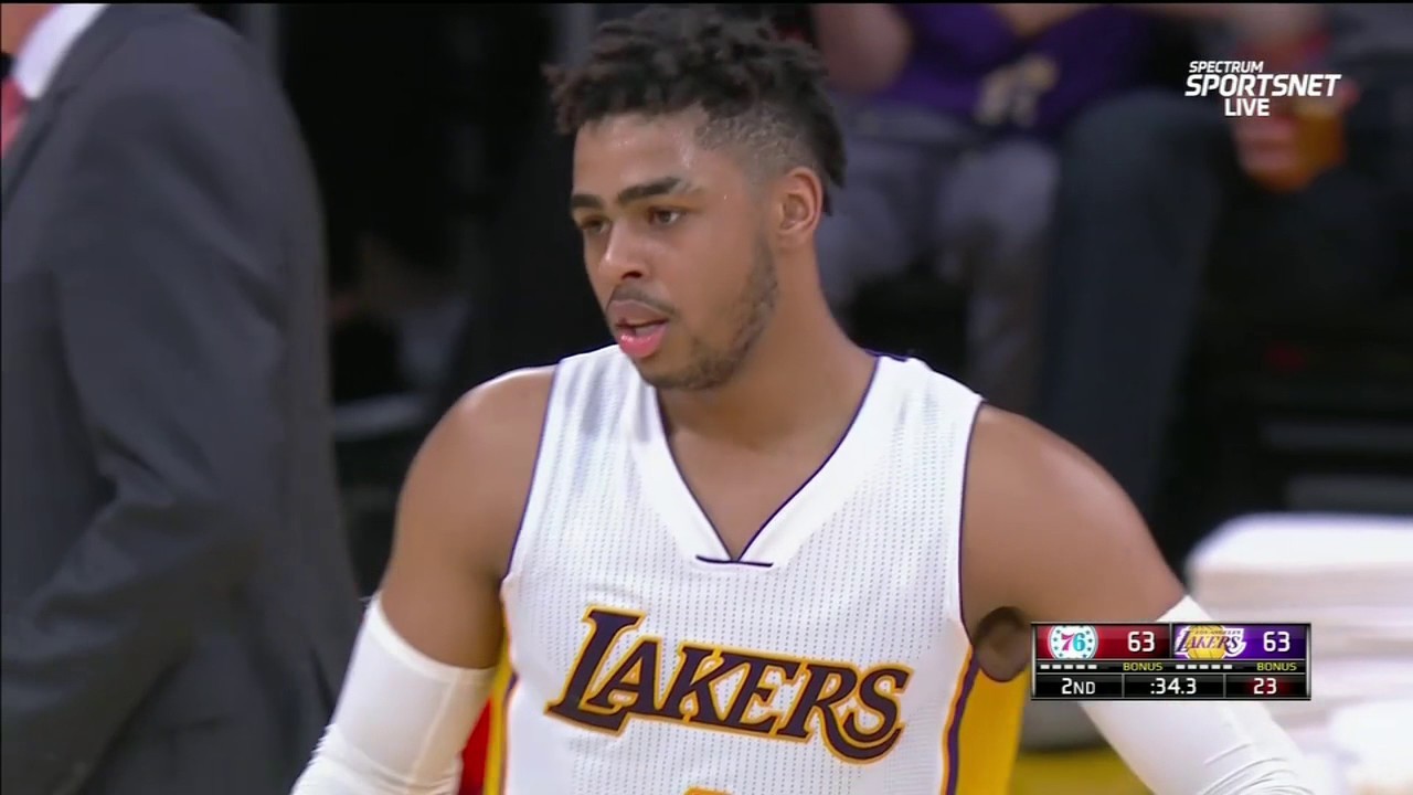 D'Angelo Russell, una de las perlas de los Lakers, cometió esta estúpida pérdida en el tercer cuarto del duelo que los Sixers ganaron a los Lakers en el Staples Center (116-118).