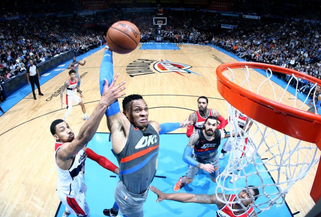 Russell Westbrook domina las pistas de la NBA con mates como el que ayer ofreció en el partido entre los Oklahoma City Thunder y los Washington Wizards.