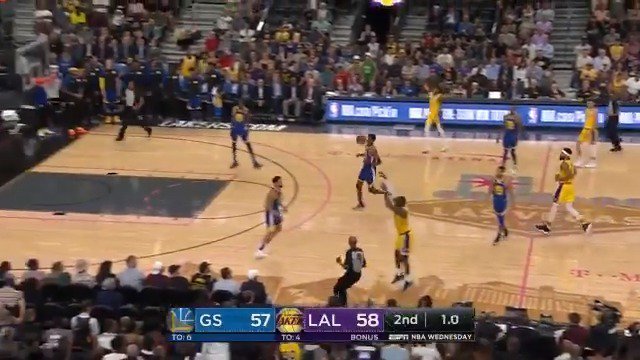 El alero, flamante jugador de los Lakers, firmó 15 puntos, 10 rebotes y 5 asistencias en el encuentro ante Golden State. Además, protagonizó la canasta de la noche. Atención a la mirada final.