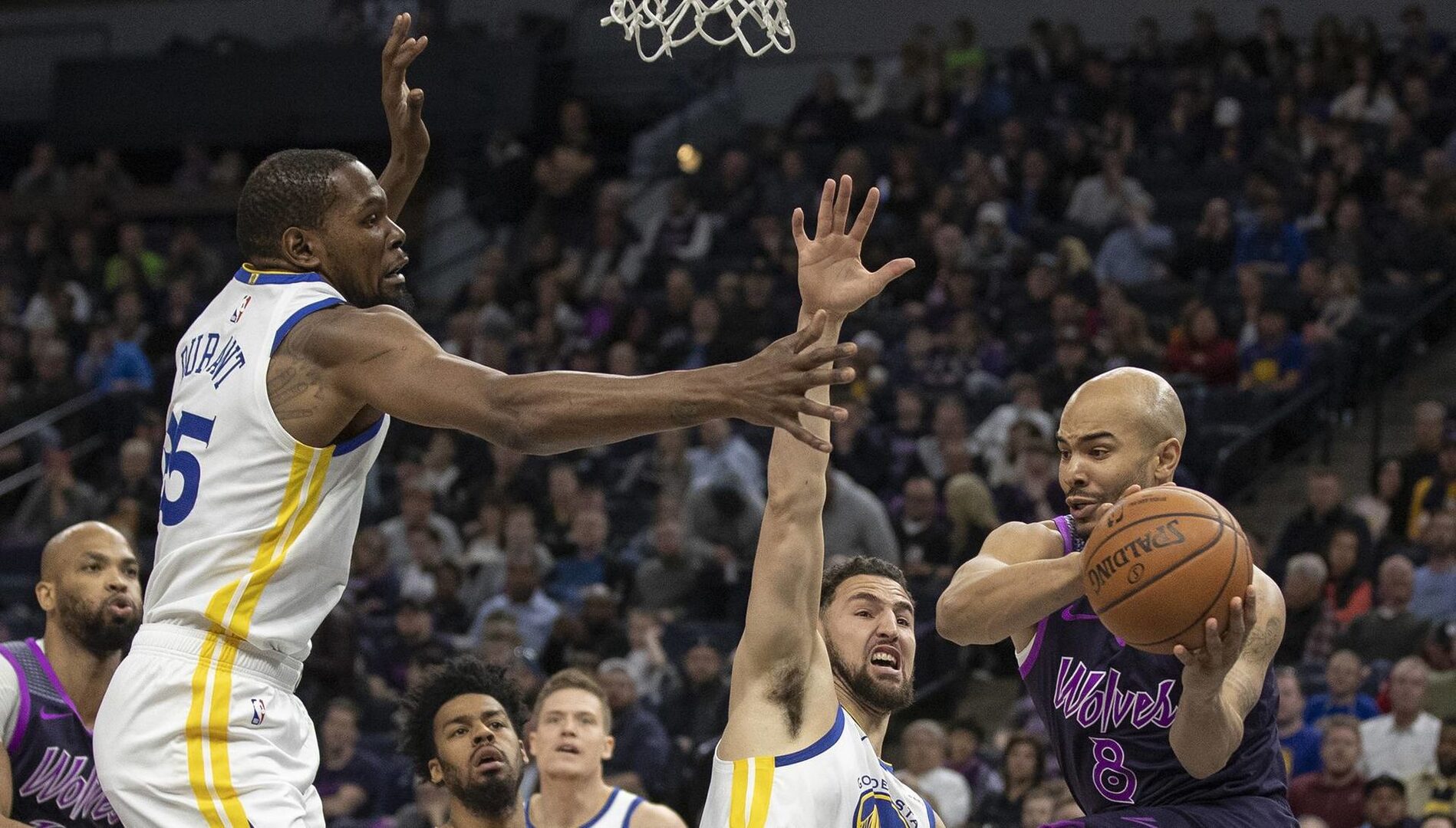 Polémico final en el Wolves-Warriors. Primero no dan de tiro la falta a Durant(Luego Curry se juega bastante tontamente la técnica, que no llega. Finalmente falta cuestionable a KAT de KD (aunque sí que agarre) pic.twitter.com/bG7VgD89zW