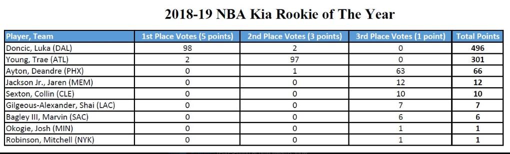 Una vez se hicieron públicos los datos de la votación, lo primero que se debía mirar era la diferencia con su máximo competidor por el galardón, Trae Young, el jugador de Atlanta Hawks. Pues bien, las votaciones también dejaron ver de forma tajante cuál era la abismal diferencia: Doncic se llevó la primera posición en los votos en 98 ocasiones (cada voto se computa con 5 puntos), dos terminó en segunda posición (3 puntos) y ninguna en tercera, para sumar un total de 496 votos, a 195 de distancia de Young, segundo clasificado.