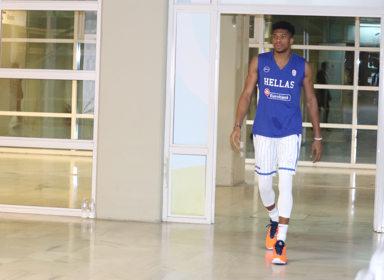 Giannis Antetokounmpo, de blanco, durante un entrenamiento con la selección griega