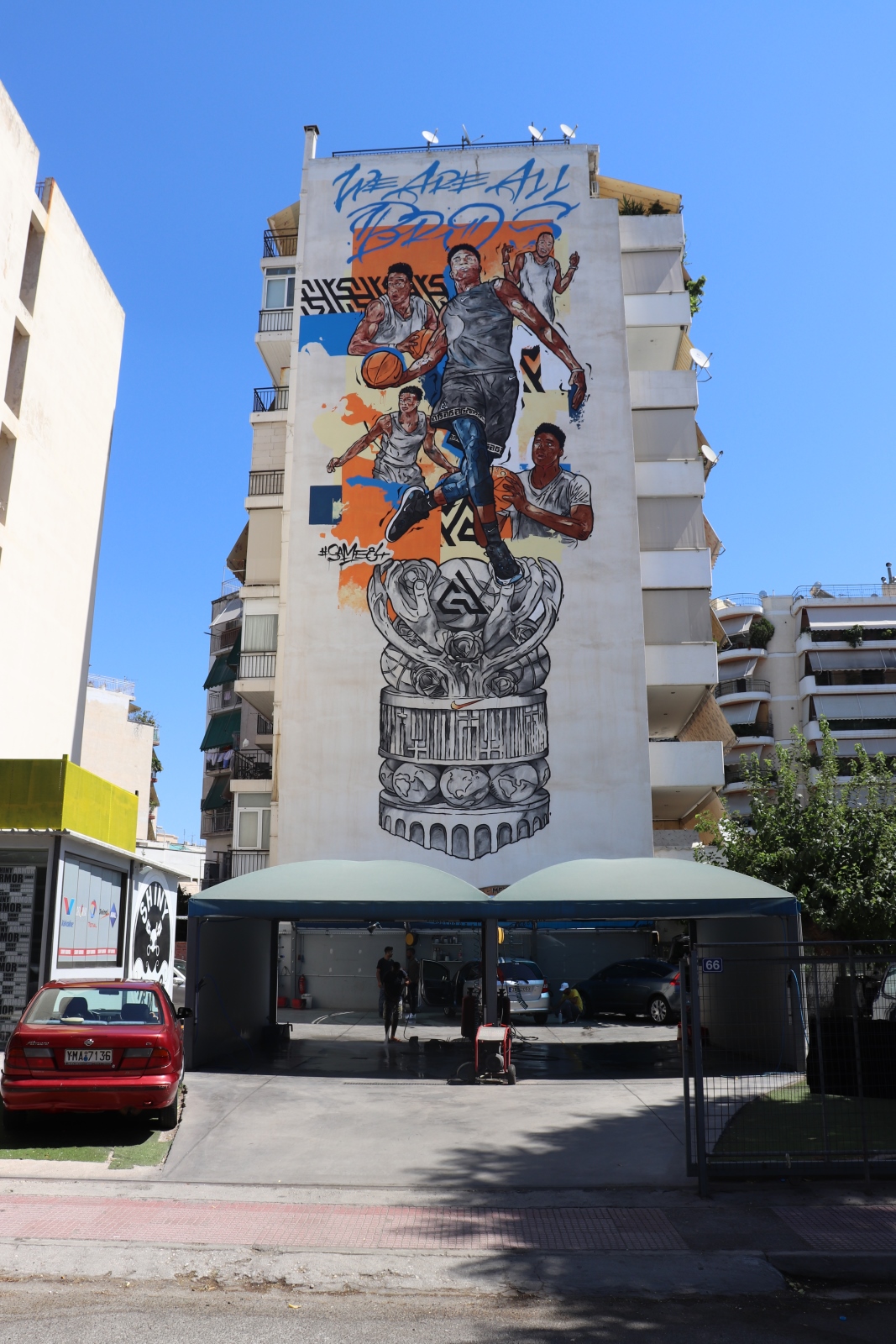 Justo al lado de la cancha en Sepolia, la fachada de este edificio también ha sido decorada por Same84, bajo la financiación de Nike, con Antetokounmpo y sus hermanos, bajo el lema 'We are all bros' (Todos somos hermanos)
