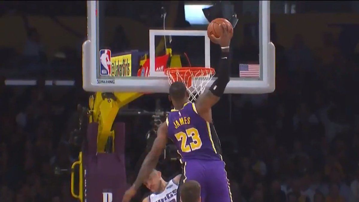LeBronJames firmó un doble-doble de 29 puntos y 11 asistencias en la victoria de los Lakers ante los Sacramento Kings (99-97). Pero sobre todo el alero dejó para el recuerdo este brutal mate.