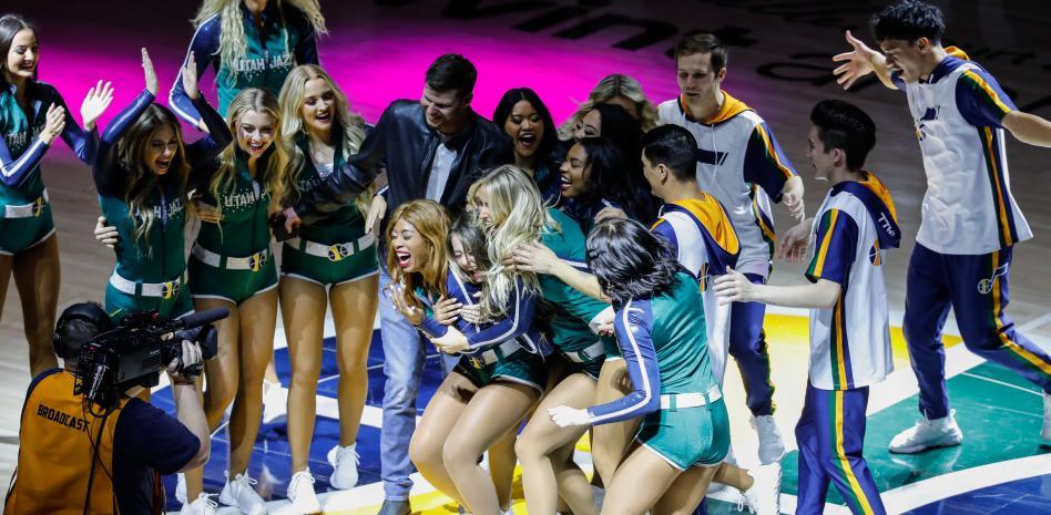 Emocionante, de película lo que ocurrió esta pasada madrugada en el estado mormón de Salt Lake City. En pleno partido de la NBA, la líder de las cheerleaders de los Utah Jazz se llevó la sorpresa de su vida. En plena actuación en el centro del campo, sus compañeras cambiaron la coreografía prevista. Desnortada, la protagonista de esta preciosa historia no entendía nada.