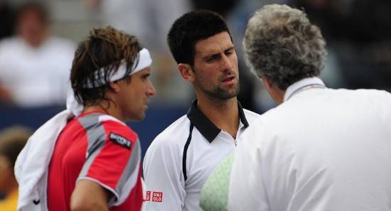 El partido de semifinales del Abierto de Estados Unidos que disputaban el serbio Novak Djokovic, segundo favorito, y el español David Ferrer, cuarto, tuvo que ser suspendido cuando se jugaba el primer set debido a las malas condiciones meteorológicas, que amenazaban incluso con la presencia de tornados.
