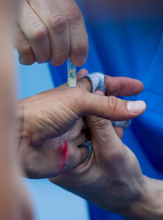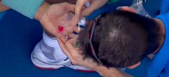 Plano cenital de la llaga del número uno mundial en la mano izquierda mientras recibe la asistencia de uno de los médicos del torneo.