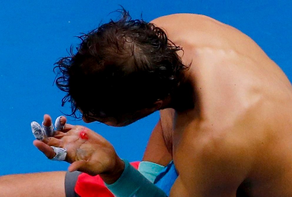 Durante un descanso del partido ante Kei Nishikori, Rafa Nadal comprueba cómo su mano está en carne viva.
