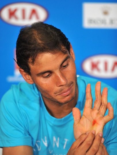 Rafa Nadal muestra su mano herida en la rueda de prensa posterior al encuentro ante Kei Nishikori. El próximo rival del manacorense, en cuartos de final, será el búlgaro Grigor Dimitrov, número 22 en la clasificación de la ATP.