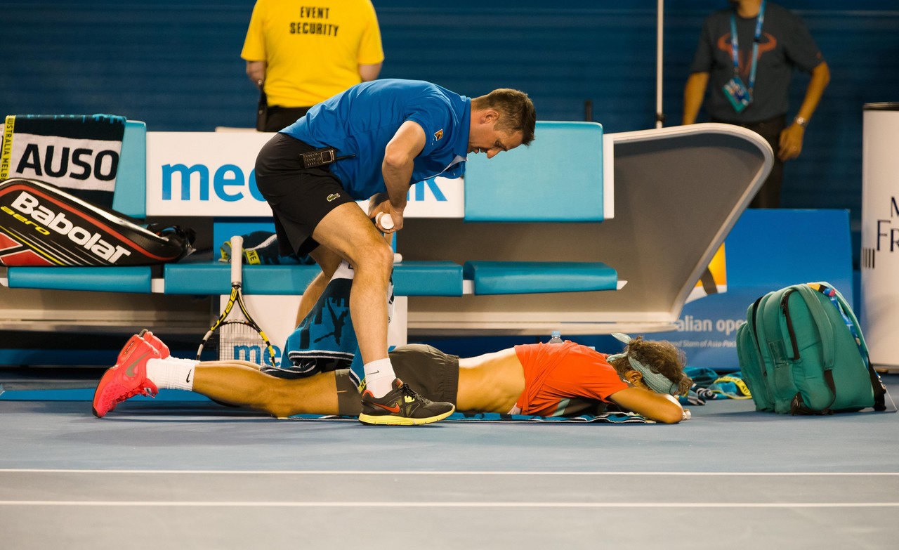 Nada más comenzar la final del Abierto de Australia frente a Wawrinka, Nadal hizo entrar a la pista a su fisioterapia por unos pinchazos en la espalda. Sin embargo, las molestias fueron aumentando con el paso de los minutos. A pesar de esto, Nadal no tiró la toalla e incluso pudo ganar un set.