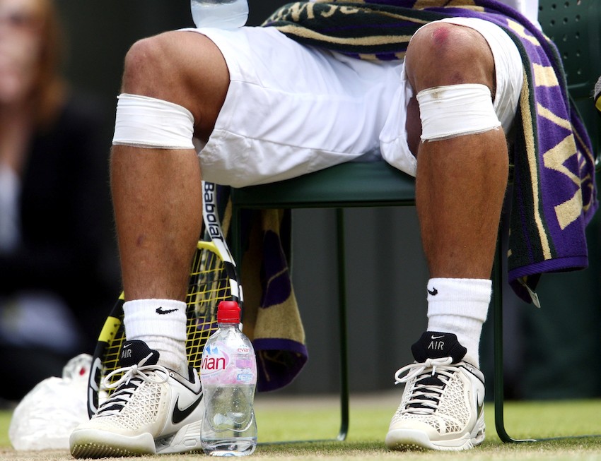 En 2008, Rafa Nadal sufrió una lesión en la rodilla izquierda durante la semifinal de Wimbledon ante Rainer Schuettler. Aun así, el español se impuso en tres sets para alcanzar su tercera final en All England Club