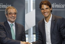 Rafa Nadal estrecha su mano con la de César Alierta tras la firma del contrato en la sede de la compañía. | EFE