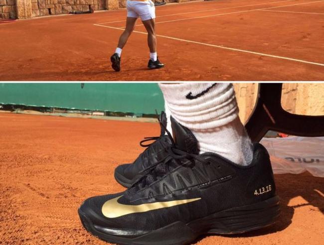 En el comienzo de su temporada europea sobre arcilla, el zurdo balear, semifinalista sobre esa superficie en Buenos Aires y Río de Janeiro, lució unas zapatillas negras con motivos dorados y la inscripción "4.13.16".
