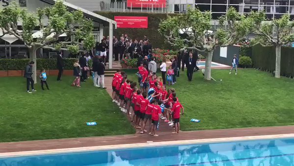 Un año más, el manacorense se dio un chapuzón junto a un grupo de recogepelotas en una piscina para celebrar su título en el Trofeo Godó.