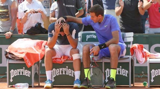 Bonito gesto de Juan Martín del Potro al saltar al otro lado de la pista y acercarse a consolar a su rival, Nico Almagro, durante el partido de segunda ronda de Roland Garros que enfrentaba a ambos.
