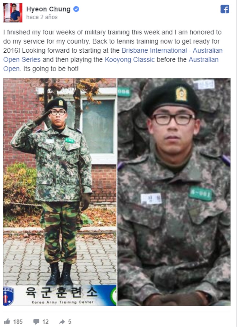 Gracias a su éxito en el tenis, Chung solo tuvo que realizar un mes de entrenamiento militar a finales de 2015 para después ya poder enfocarse de lleno en el deporte. "Fue una buena experiencia para mi vida", destacó entonces.