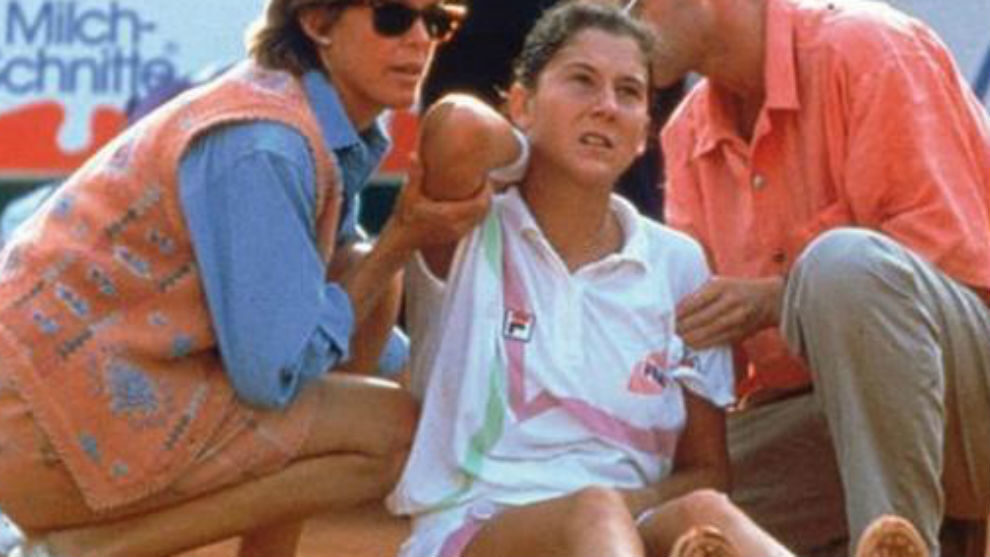"Durante el descanso, tras un juego, apuré hasta el final porque no había bebido nada de agua y de pronto sentí un dolor horrible en mi espalda... Me giré buscando de dónde venía el dolor y vi a un hombre detrás de mí levantando un cuchillo contra mí". Así relata lo sucedido la propia Monica Seles.
