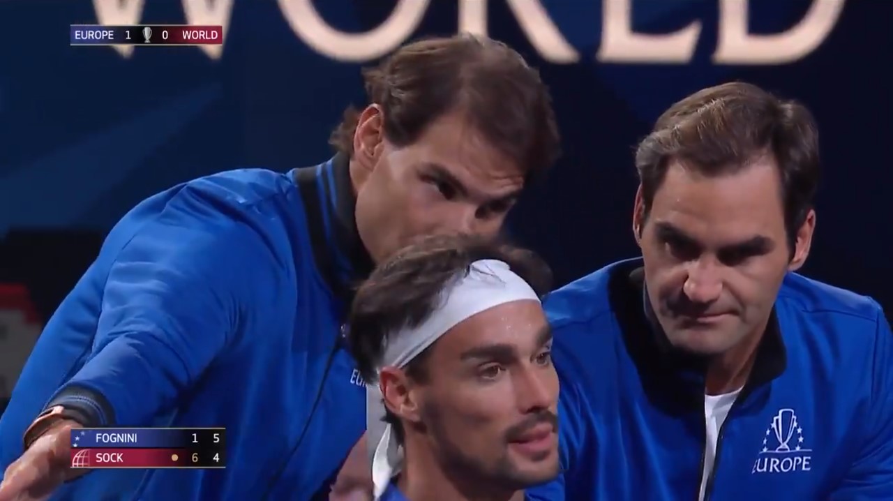 Durante el segundo partido de la Laver Cup que enfrentaba a Fognini y al estadounidense Jack Sock, Rafa y Roger le aconsejan en un descanso. El español le anima con un "no te frustres, está perfecto".