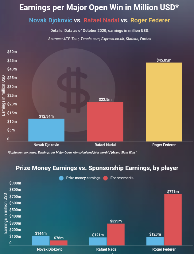 Es probable que Nadal y Djokovic superen el récord de los 20 títulos de Grand Slam de Federer en un futuro cercano, pero también altamente improbable que el español o el serbio superen las ganancias del helvético tanto por los premios en metálico obtenidos a lo largo de su carrera como por los acuerdos de patrocinio.