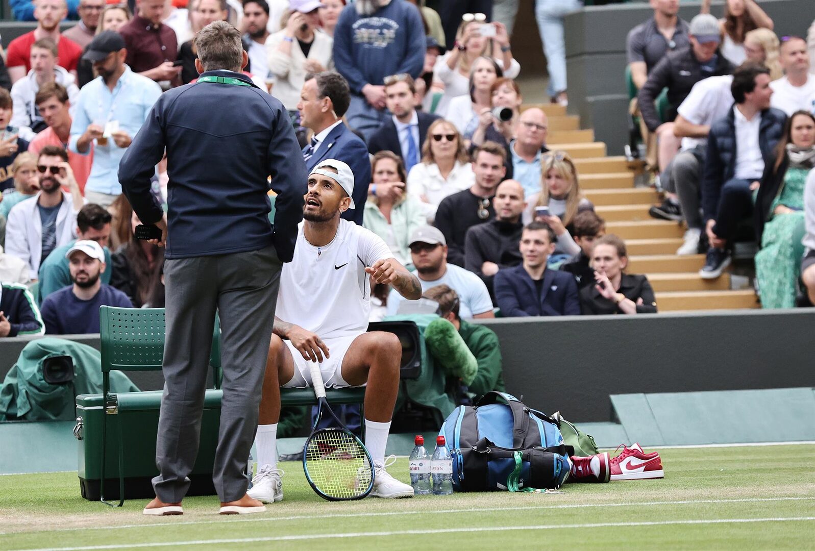 Tras un punto, Tsitsipas le dio un pelotazo al público. La pelota rozó a una señora y Kyrgios pidió la descalificación de su rival. "¿Eres estúpido? ¿Cómo puedes tirar una pelota a la grada, darle a alguien y no ser descalificado? ¿Tiene que salir herido para que le descalifiques?", le dijo el australiano al juez de silla tras la acción del griego.