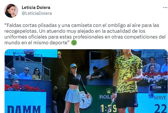 "Faldas cortas plisadas y una camiseta con el ombligo al aire para las recogepelotas. Un atuendo muy alejado en la actualidad de los uniformes oficiales para estas profesionales en otras competiciones del mundo en el mismo deporte", comentó Leticia en su Twitter.