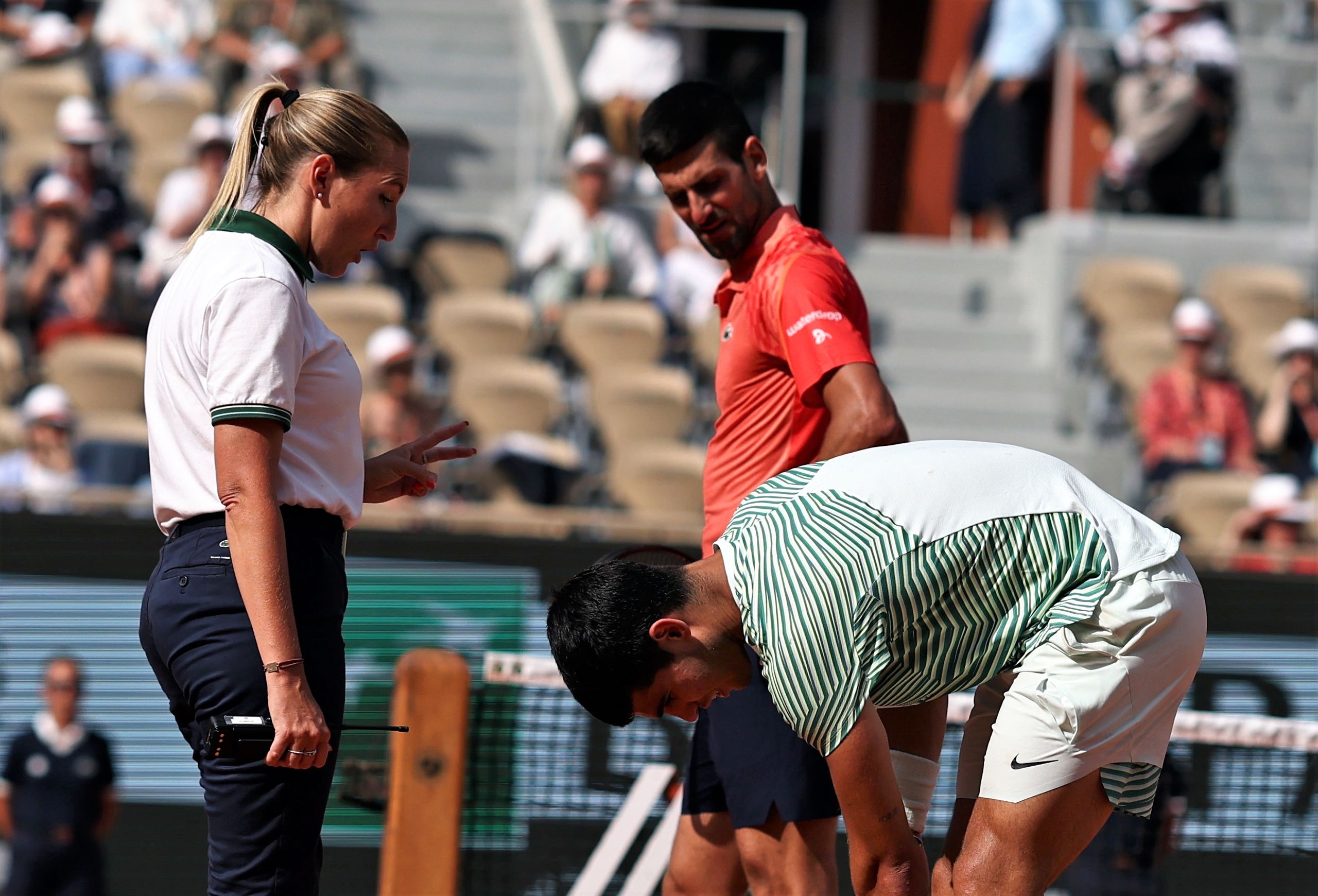 Forzó para seguir, pero apenas podía correr ni responder al juego del belgradense, que se fue apuntando los juegos algo incrédulo por la situación. Así ganó el tercer set, sin oposición alguna. El público de la Philippe Chatrier no lo podía creer y, tras unos minutos de asistencia médica en el vestuario, Alcaraz regresó a la pista entre gritos de "¡Carlos, Carlos!". Mejoró algo su nivel, tuvo dos bolas de rotura en el segundo y hasta ganó un juego, pero Djokovic apenas encontraba oposición y todo le fue cuesta abajo para ganar el cuarto set —y con ello el partido— después de casi tres horas y media.