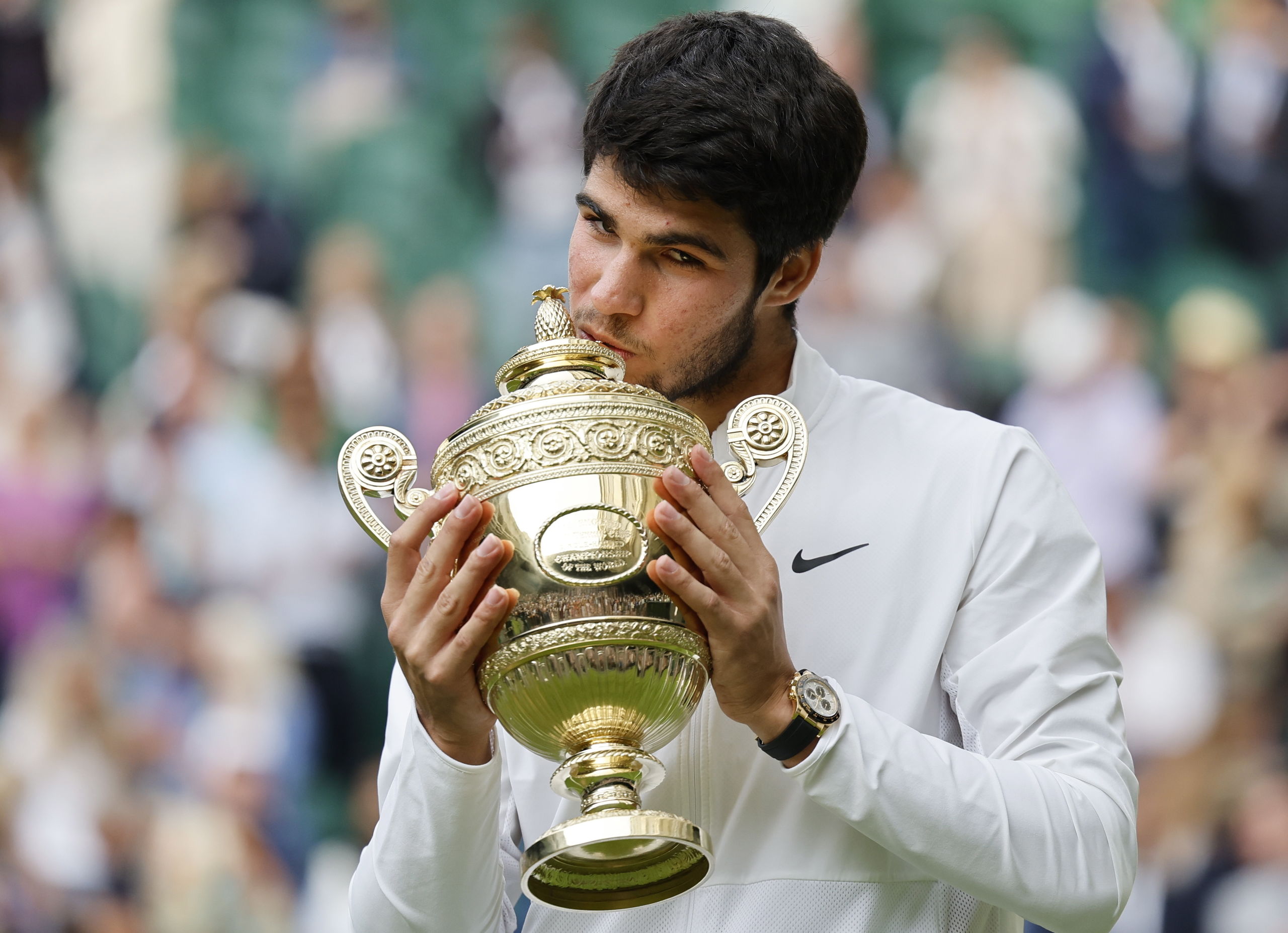 Carlos Alcaraz besa el trofeo dorado que le acredita como ganador del torneo de Wimbledon tras superar a Novak Djokovic en una gran final disputada a cinco sets y tras casi cinco horas de partido.