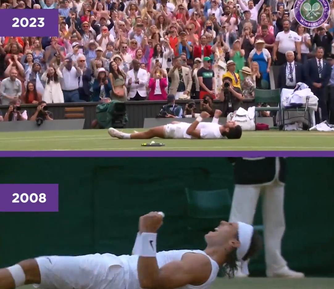 Wimbledon 2008 y Wimbledon 2023. Dos españoles coronándose en la pista central del mejor torneo del mundo. Rafa Nadal por un lado y por el otro Carlos Alcaraz. Ambos con su saque y ambos viendo como el rival, Federer y Djokovic, perdían el partido golpeando la red con sus respectivas derechas.