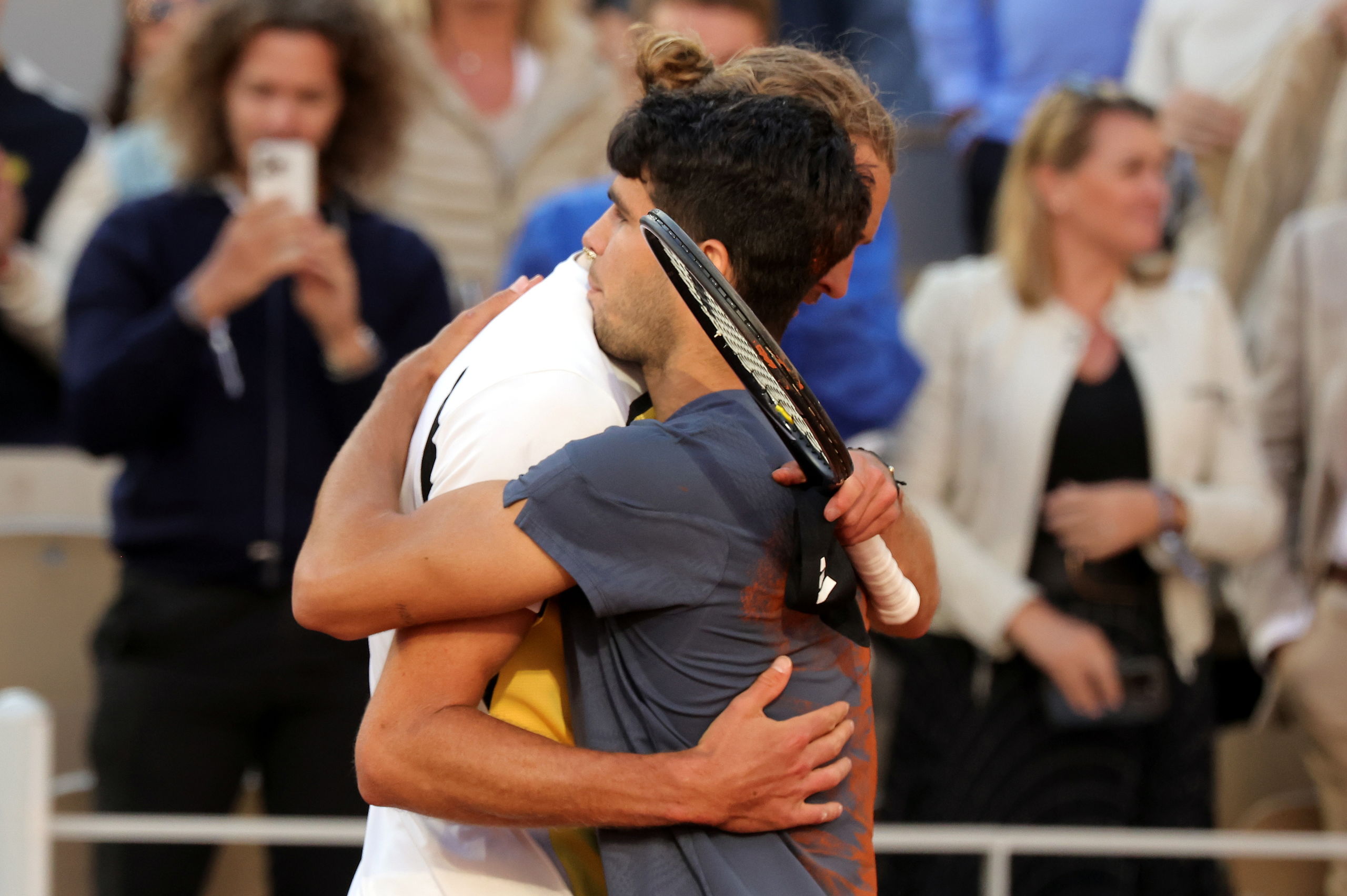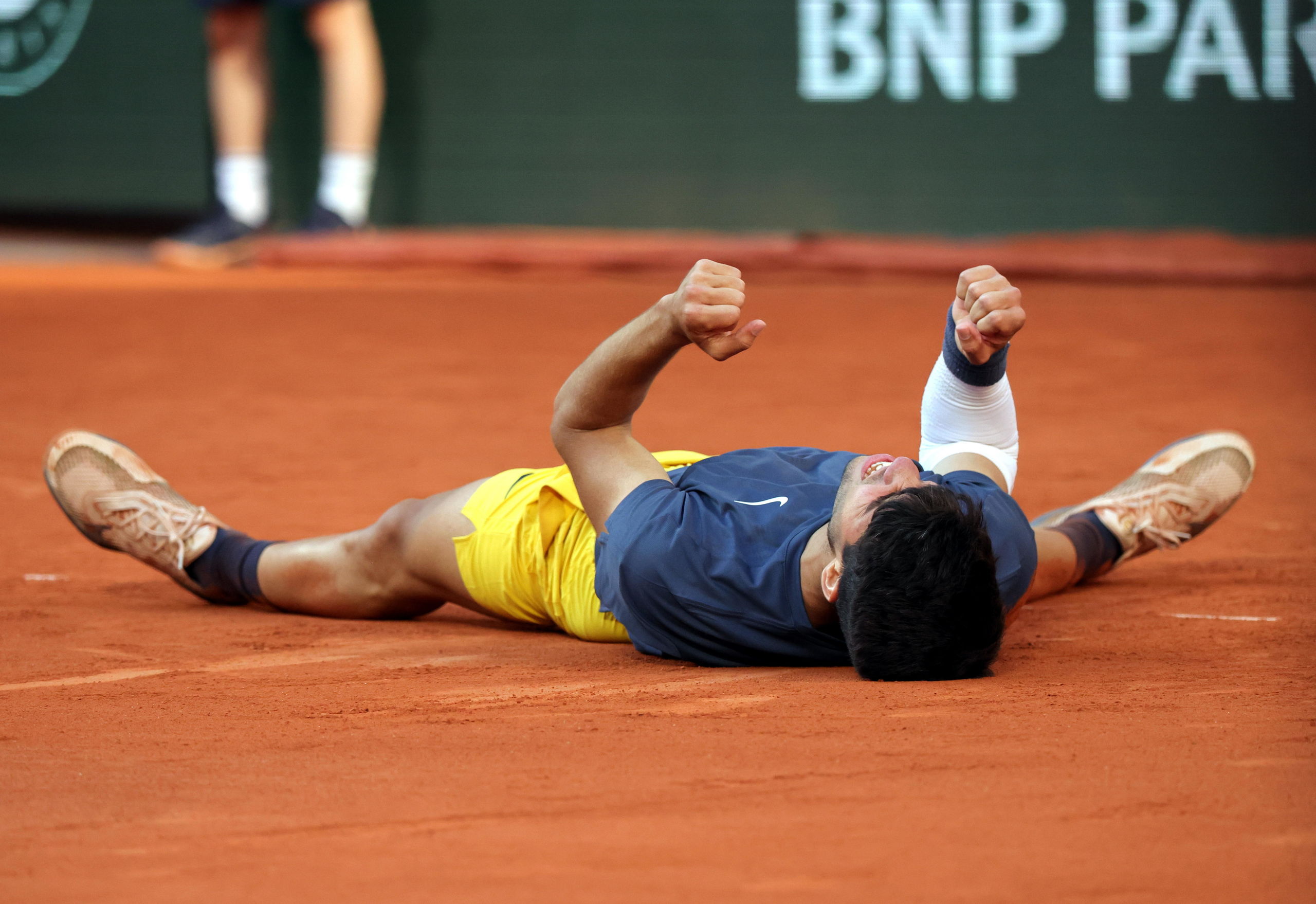 Alcaraz se tiró al suelo de la Philippe Chatrier nada más terminar su partido contra Zverev (6-3, 2-6, 5-7, 6-1 y 6-2).