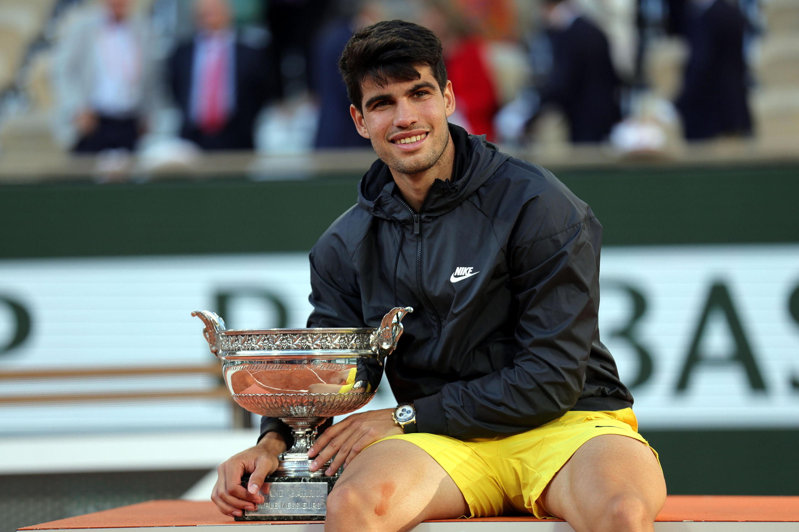 Carlos Alcaraz posa con la Copa de los Mosqueteros tras conquistar su primer título en Roland Garros.