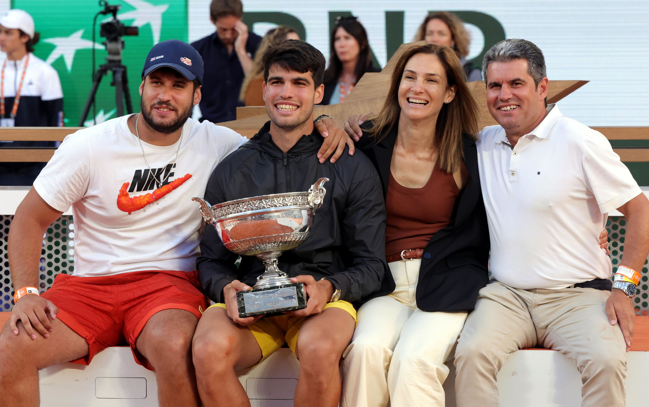 El murciano, radiante en la Pista Philippe Chatrier junto a sus padres (Carlos y Virginia) y su hermano mayor Álvaro.