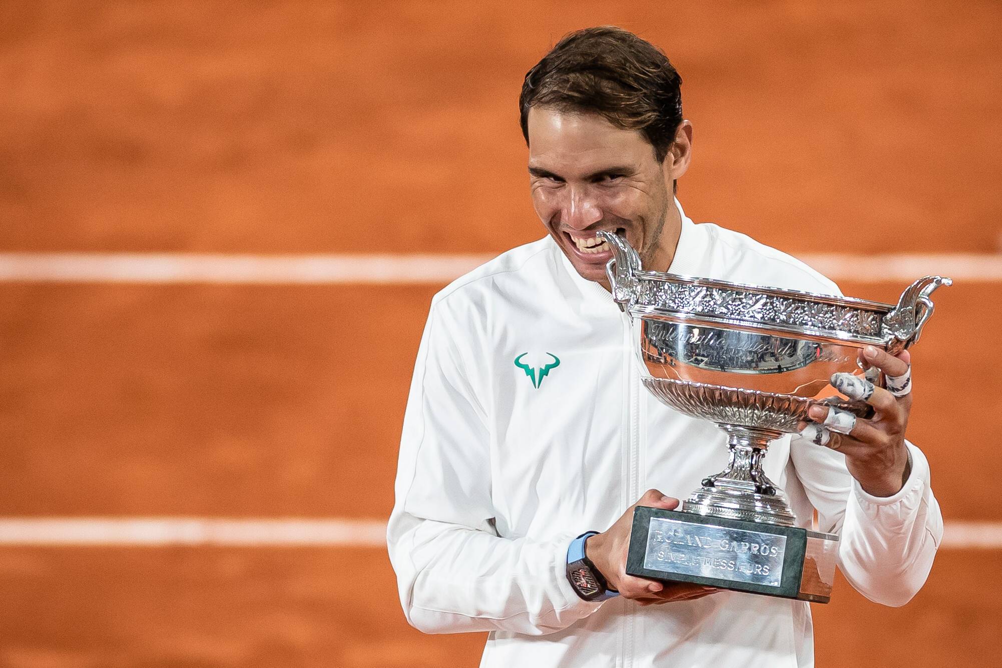 Rafa Nadal celebra con el trofeo después de ganar al serbio Novak Djokovik en la final en Roland Garros en París, el 11 de octubre de 2020. Nadal cerró su título de ‘Grand Slam’ número 20 con un saque directo.