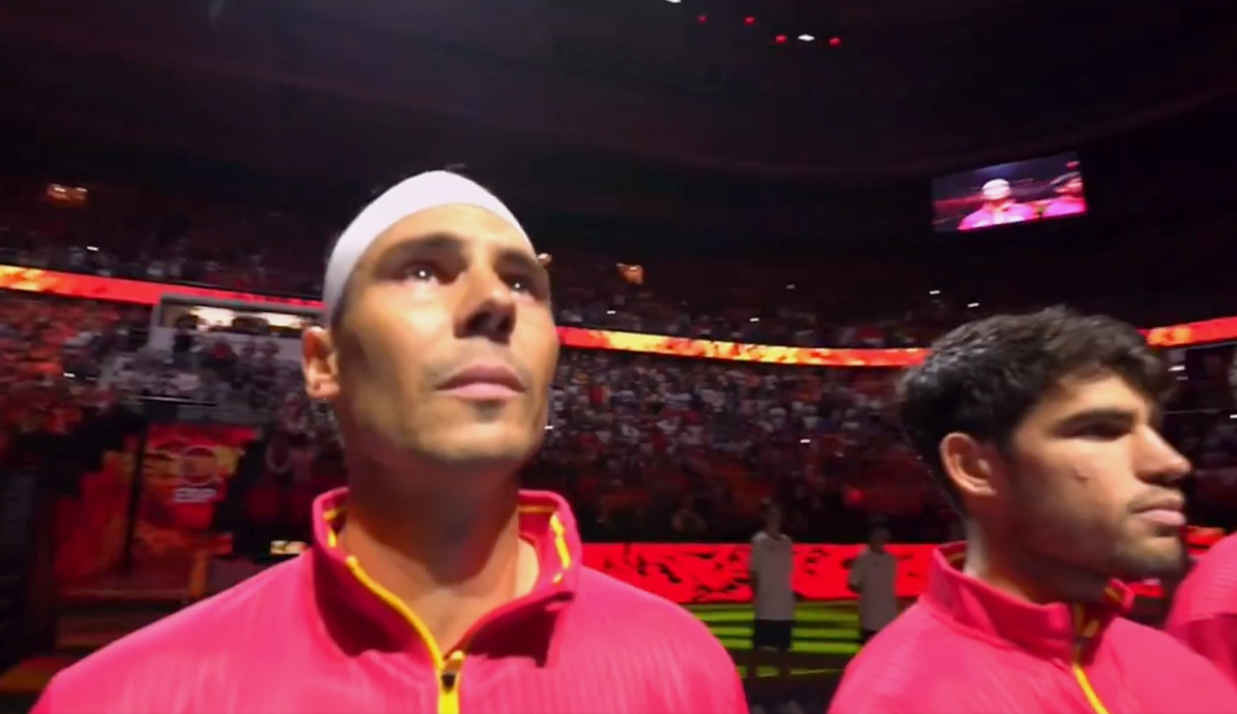Podría ser el último partido de Rafa como tenista profesional, por lo que las cámaras quisieron centrarse en su figura. El balear, concentradísimo, calentaba en el interior del pabellón mientras esperaba saltar a la cancha acompañado por el resto del equipo español, aparentemente más relajado.