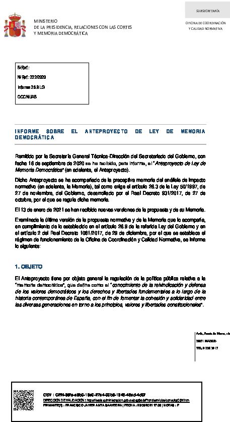 Informe de la Secretaría General Técnica sobre el Anteproyecto de ley de Memoria Democrática