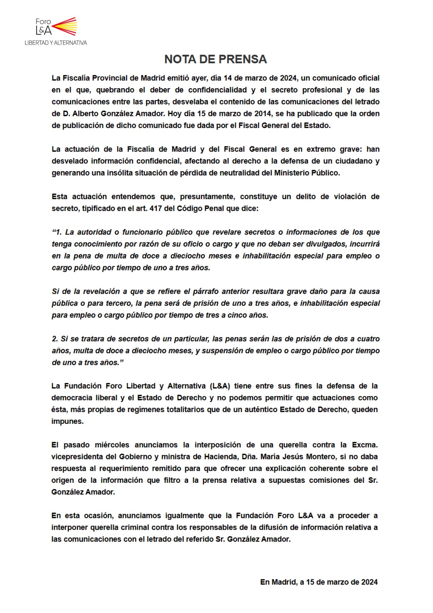 La Fundación Foro L&A va a proceder a interponer querella criminal contra los responsables de al difusión de información relativa a las comunicaciones con el letrado del referido Sr. González Amador.