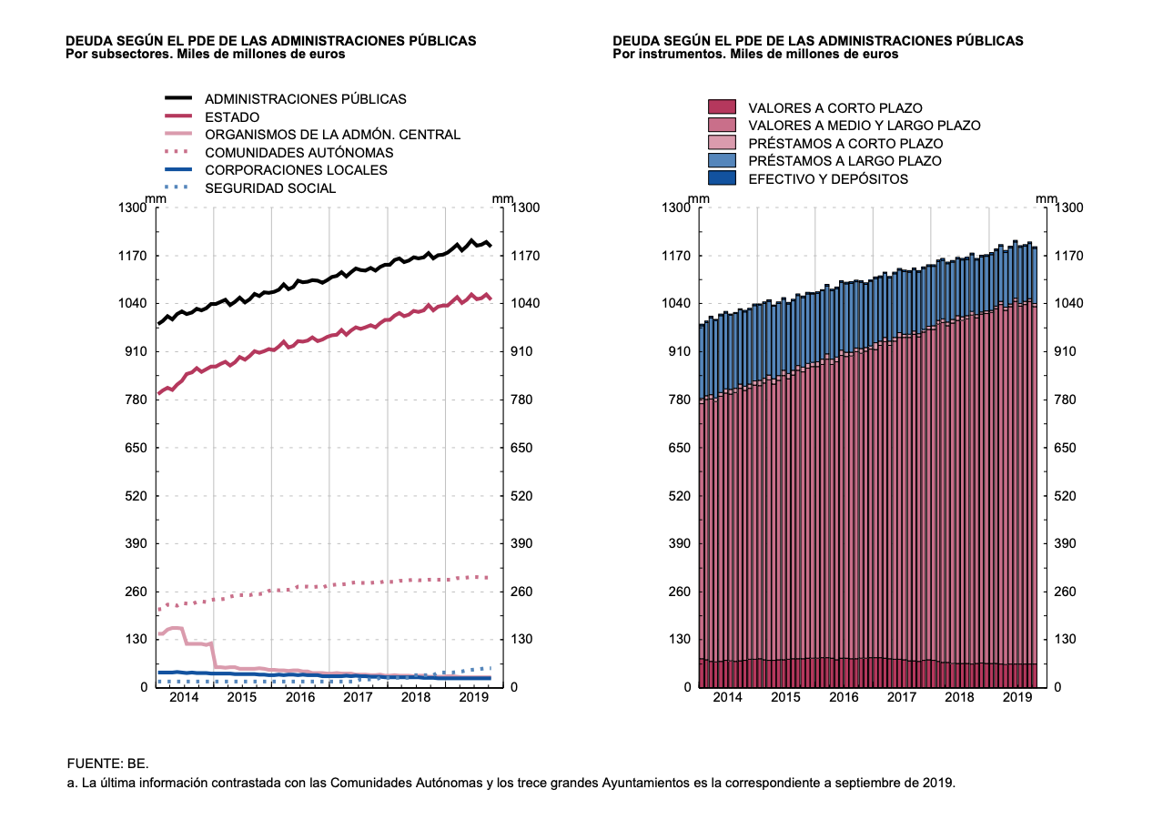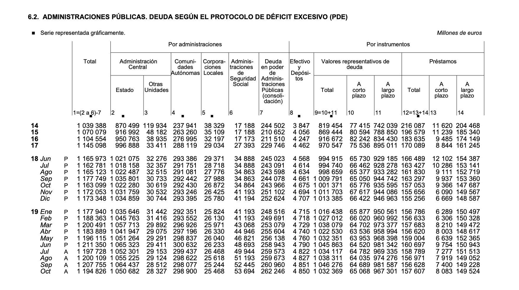 - El gobierno central debía 1.021.075 millones de euros en junio de 2018, cuando Pedro Sánchez llegó al poder, y acumulaba en octubre de 2019 unas obligaciones de 1.050.682 millones de euros.