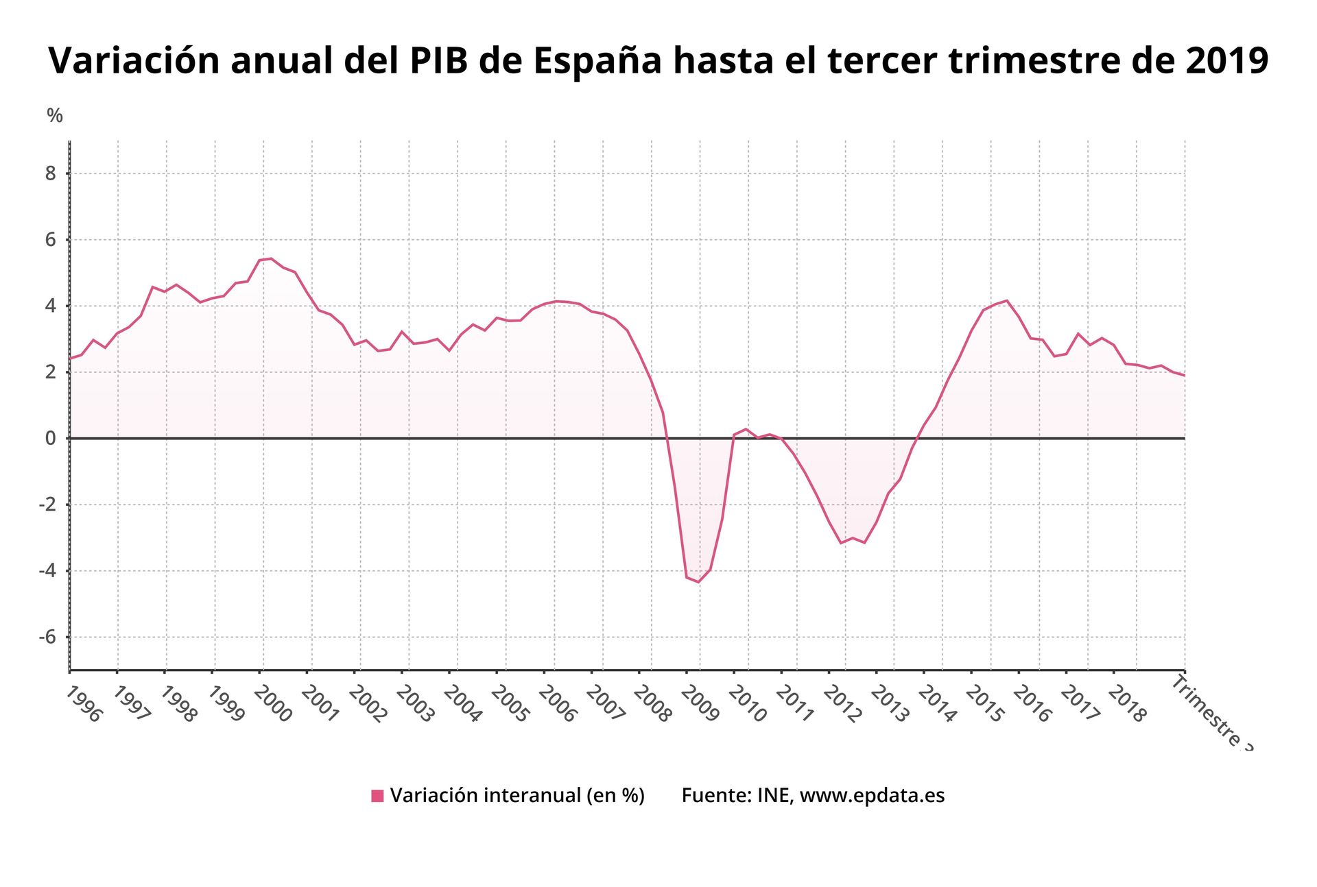 En valores interanuales, la economía española desaceleró una décima su crecimiento, hasta el 1,9%, una décima menos de lo que había anticipado el INE a finales de octubre. Este crecimiento se basó casi exclusivamente en la demanda interna, que aportó 1,8 puntos, frente a un sector exterior que sólo contribuyó con una décima al avance interanual del PIB.