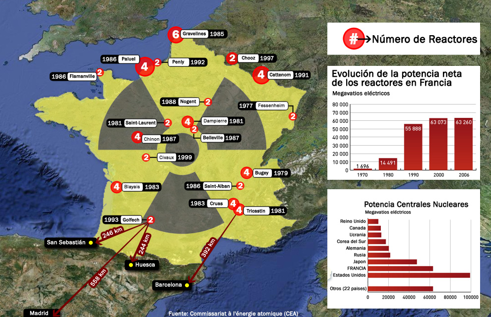 Francia (con larguísimas fronteras tanto con España como con Alemania) es el segundo país del mundo por potencia nuclear instalada. A raíz de la crisis de 1973, con la posterior carestía de petróleo y el encarecimiento de todos los productos derivados, el Gobierno galo hizo una apuesta decidida por la energía nuclear (hay que recordar que éste es un sector intervenido también en Francia, como en casi todos los países europeos). Esta decisión ha llevado a que se abran en el país una veintena de centrales que suman un total de 58 reactores, que producen un total de 430.000 millones de kilovatios/hora cada año. Es el 75% de la electricidad que consumen sus ciudadanos, lo que le deja como el país (entre las grandes potencias) más dependientes de las centrales.