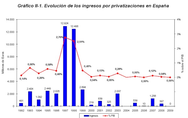 En los años 80 y 90, el Estado español acometió una serie de privatizaciones que le llevaron a desprenderse de compañías como Iberia, Telefónica, Repsol o Seat. Aquellas ventas permitieron dotar de recursos al Estado, reducir su déficit y crear compañías privadas eficientes y que en estos momentos son líderes en sus respectivos sectores. Sin embargo de los más de 12.000 millones que se obtuvieron por este concepto en 1997 y 1998, se ha pasado a los 398 millones de 2008 y a los 0 del año pasado. Pero queda mucho por privatizar.