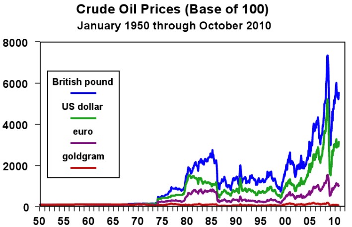 Al contrario que las monedas de los gobiernos, el oro no se puede producir de forma masiva ni repentina y por ello ofrece estabilidad. ¿Cómo se puede comprobar esto? Mediante la relación que guarda con otros bienes tangibles: un gramo de oro compra hoy la misma cantidad de petróleo que en 1971. Sin embargo, para comprar la cantidad de petróleo que compraba entonces un dólar hoy son necesarios casi tres mil.