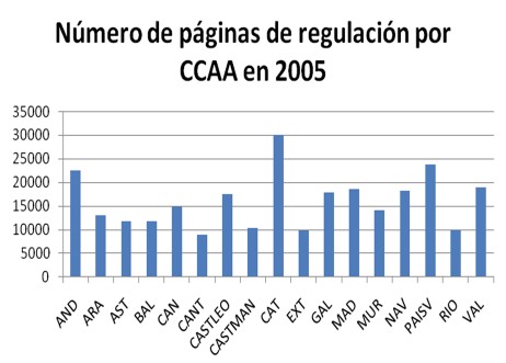 El informe también señala que hay importantes diferencias regulatorias entre regiones. "Para hacernos una idea, según nuestros datos (tomados del repertorio de legislación autonómica de Aranzadi, que se elabora individualmente por CCAA), en 2005 Cataluña había promulgado un total de alrededor de 30.000 páginas de regulación con 12.000 nuevas normas. En cambio, Cantabria sólo había adoptado 3.400 nuevas normas, que ocupaban alrededor de 9.000 páginas". Cataluña lidera, así, la producción regulatoria a nivel regional.