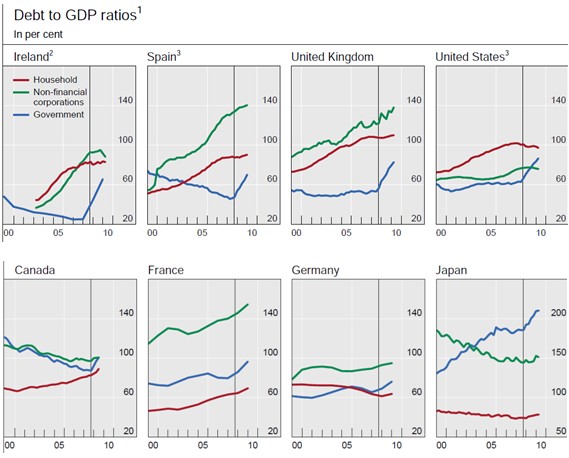 Excepciones de este patrón son, sin embargo, Alemania, donde el nivel de deuda permaneció estable, y Japón, único caso en el que fue el sector público quien lideró el aumento en la deuda.