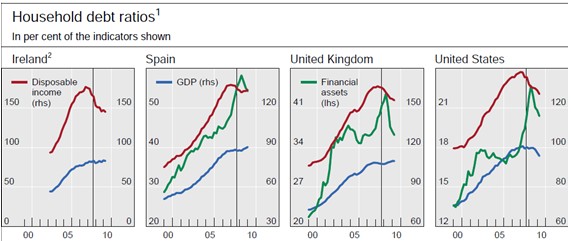 Tal y como ilustra el siguiente gráfico, el boom inmobiliario que protagonizó la fase de crecimiento de diversas economías avanzadas estuvo acompañado de un importante incremento en el nivel de deuda del sector privado no financiero (empresas y familias). La insostenibilidad de este esquema se ha ratificado tras el estallido de la burbuja crediticia que tuvo lugar en 2007.