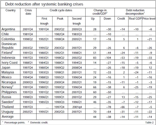 El segundo hallazgo del estudio es que 17 de las 20 crisis que fueron precedidas por un incremento en la ratio entre volumen de crédito del sector privado y producción nacional (crédito/PIB) experimentaron una reducción posterior considerable del mismo. Mientras que el crédito privado sobre el PIB se incrementó una media de 44 puntos porcentuales antes de la crisis, el posterior estallido de boom causó una caída media de 38 puntos porcentuales en este mismo indicador.