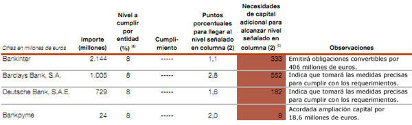 Por parte de los bancos, el BdE ha indicado que necesitan captar capital antes de octubre Bankinter (333 millones de euros), Barclays (552), Deutsche Bank (182) y Bankpyme (8).