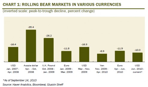 Tal y como muestra el siguiente gráfico elaborado por el analista David Rosenberg, la guerra ya ha estallado y ahora tan sólo se intensifica. Los bancos centrales compiten entre sí desde 2007 para devaluar sus respectivas monedas.