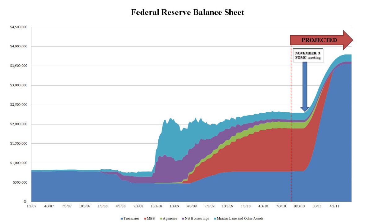 Es decir, la FED no sólo dispondría de 1,5 billones adicionales para comprar deuda del Tesoro, sino también de otros 1,5 billones procedentes del prepago de cédulas hipotecarias. De este modo, el QE2 amenaza con superar los 3 billones de dólares. El balance de la FED pasaría así de los 2,3 a cerca de 3,8 billones de dólares (aumento neto de 1,5), todo un récord en la historia del banco central, ya que multiplicaría casi por cinco la oferta monetaria existente antes del estallido de la crisis, a mediados de 2007.